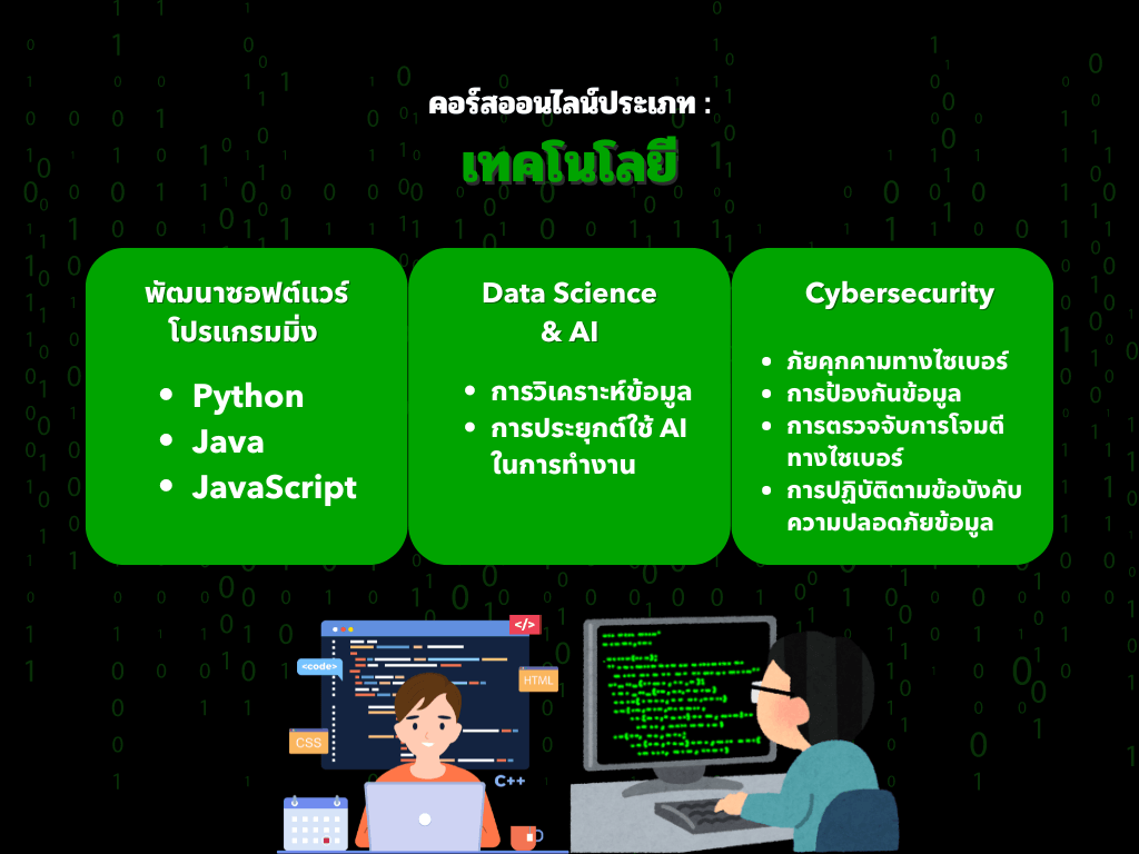 คอร์สเรียนออนไลน์หมวดหมู่เทคโนโลยีการเป็นอีกหนึ่งหมวดหมู่ที่ผู้คนในปัจจุบันให้ความสำคัญอย่างยิ่ง เพราะยุคนี้ผู้คนต้องการพัฒนาทักษะและก้าวทันกับเทคโนโลยีที่เปลี่ยนแปลงอย่างรวดเร็ว